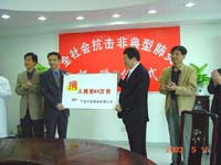 寧波市僑辦副主任劉國平出席了捐贈儀式。寧波市治療非典型肺炎的兩家定點醫院——市第二醫院和市傳染病醫院負責人也在儀式上致辭。 |