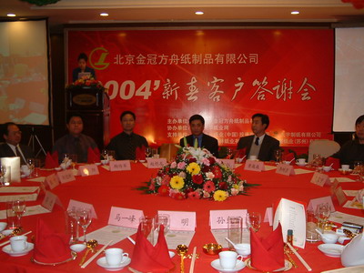 (景華紙業(yè)網獨家報道 記者何玲)元月6日,北京金冠方舟紙制品有限公司在北京金域萬豪酒店召開2004年新春客戶答謝會,公司總經理朱勇先生出席大會向各位新老客戶恭祝新春快樂并作了精彩發(fā)言。此次答謝會由金冠方舟紙制品有限公司主辦,景華紙業(yè)網協(xié)辦,支持單位為:金光紙業(yè)集團、大宇制紙、泉林集團和金華盛紙業(yè)。全國各地的客戶、經銷商等眾多嘉賓參加了答謝會。