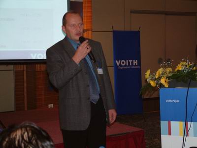 25日早上9點,“超越2004”客戶技術交流會正式開始,福伊特造紙技術中國區總裁劉明明女士首先致歡迎辭。劉明明說,幾十年前,VOITH就是業內被認為是第一流的設備供應商并建立了造紙技術的標準,并以其服務、技術實力和與眾不同的、專業化的項目管理而著稱。所有這些標準都是成功的造紙生產的基礎,但實現長期成功的、具有決定意義的關鍵詞卻是可靠性!邀請各位出席這次交流會,福伊特將向各位提供VOITH的信息、技術以及全面的服務。我們確信只有從漿料制備到造紙設備以及整飾和包裝的完美工藝技術才對高效率的生產工藝具有重要作用。為此邀請大家聽一聽演講,并提出問題,共同進行深入的討論和對話。