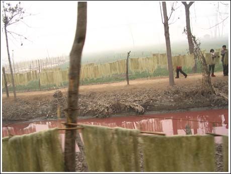 在污水渠旁晾曬的粉條