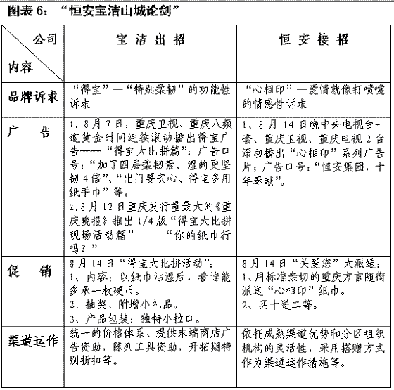 而恒安集團發(fā)展之道所謂的“狠”,其實是一種“執(zhí)著”。它不僅體現(xiàn)在早期實施目標聚集戰(zhàn)略時對區(qū)域市場一個個“以點帶面”的強行突破,也反映在不斷通過技術創(chuàng)新等方式,專注做深做細同一行業(yè)(比如衛(wèi)生巾產(chǎn)品的升級換代);更表現(xiàn)在與諸多跨國公司強勁對手爭鋒時,毫不退讓,寸土必爭的企業(yè)精神和求真務實的科學態(tài)度。這一點在1999年8月一場“恒安寶潔山城論劍”的事件中演義的淋漓盡致。事件大概背景是:1998年末,恒安“心相印”紙巾已占據(jù)重慶高檔紙巾市場1/3強,居市場領先地位。而寶潔繼成功推出婦孺皆知的飄柔、海飛絲、碧浪、汰漬等數(shù)十個強勢品牌后,決定以香港、重慶兩地作為試點,于1999年推出由其德國公司生產(chǎn)的“得寶”系列紙巾,意欲以其“功能定位三板斧+廣告轟炸”的一貫行銷模式,一統(tǒng)高檔紙巾市場江湖。于是,兩者之間市場遭遇戰(zhàn)再所難免。恒安面對寶潔來勢洶洶的挑戰(zhàn),從品牌訴求、廣告、促銷和渠道運作等四個方面實施了強有力的積極防御(見圖表6),成功捍衛(wèi)了重慶高檔紙巾市場江湖霸主的地位。