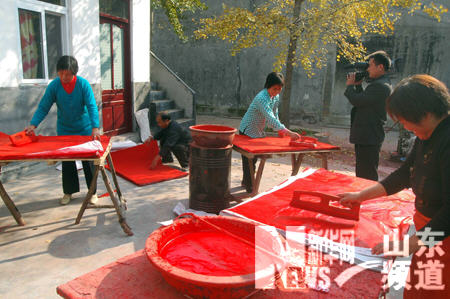 11月1日,山東省郯城縣勝利鄉(xiāng)沙沃村村民在用酸性大紅顏料粉刷紅紙。