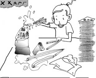 負責人:我們做的是筷子和濕巾在一起的那種套裝件,濕巾用消毒液浸泡就行,筷子,用自來水涮涮烘干就可以。然后,幾個人把筷子裝進塑料袋里就行了。