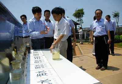 海南金海漿紙業有限公司生產部陳志勤協理正向國家環保總局專家組成員介紹堿回收系統與污水處理情況。