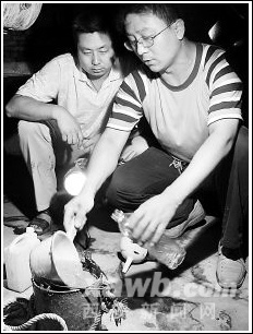 5輛款型各不相同的小車先后駛出環保局,約1個小時后汽車開進了一條寬度僅兩米多的黑暗狹長小道,雖然天氣燥熱,但雜草叢生的土路上依舊泥濘。22:59,檢查人員抵達了第一個目的地———奧輝造紙廠的排污口。從嘩嘩流出的水量可以看出,該廠目前正在生產當中,檢查人員隨即取水采樣,準備帶回化驗。