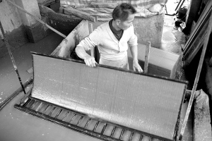 在村子里閑逛,看見每戶門前都有一個(gè)專門腌制竹子所用的石灰池,池子里已經(jīng)浸泡著竹子,在村里就看見有阿婆在劈竹子,然后包扎成一捆捆放進(jìn)浸泡池中。抄紙的小車間都是用磚頭及瓦片搭建起來(lái)的,正有村民在進(jìn)行抄紙的工序。房間中央有一個(gè)水池,池子里是打好并稀釋了的竹漿,房頂上釣著一個(gè)用以固定的釣斗,一個(gè)和釣斗一樣大小的篩網(wǎng)就是全部的工具。農(nóng)戶熟練地把釣斗往前一推,然后一沉,再往后拉起來(lái),篩網(wǎng)上就已經(jīng)均勻地鋪滿一層竹末,然后把篩網(wǎng)提起,碼在一個(gè)容器上,便成了竹紙的胚樣。每張長(zhǎng)約1.5米,寬約0.6米的竹紙就淘制出來(lái)了。