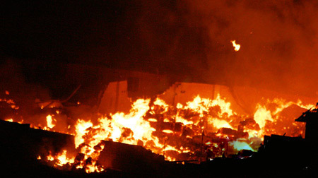 27日晚8時許,記者第一時間趕到現場時,距離事發現場約500米處,就能看到一處紅通通的火光映紅整個夜空,隱約中還能看到一股股濃煙不斷升騰。到達現場時,晉江消防隊員正拿著水槍奮力撲救,廠房木架屋頂完全塌陷下來,同車間內燃燒的草紙混成一片,人稍微一靠近,就有一股滾燙的感覺。