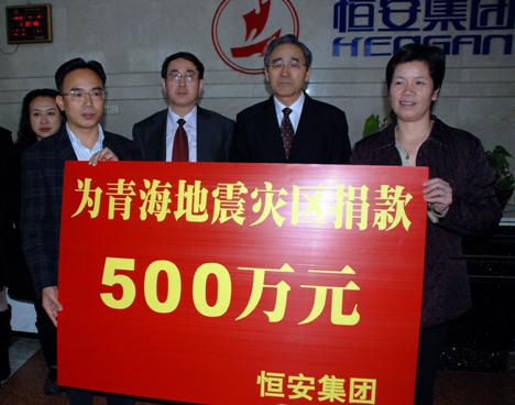 4月15日,青海玉樹地區(qū)發(fā)生地震的第二天,恒安集團(tuán)在晉江總部舉行捐贈(zèng)儀式,通過晉江市慈善總會(huì)向青海玉樹地震災(zāi)區(qū)捐款500萬元。