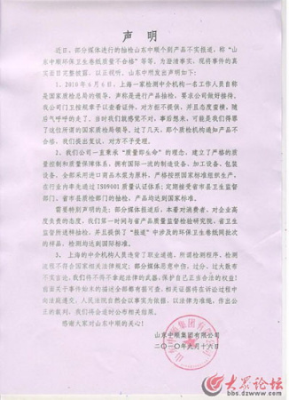 日前,國家質(zhì)檢總局在其網(wǎng)站公布2010年衛(wèi)生紙產(chǎn)品質(zhì)量國家監(jiān)督專項抽查結(jié)果,包括山東中順在內(nèi)的47家企業(yè)、50種產(chǎn)品被曝光,而就在最近,一份署名為“山東中順集團有限公司”的企業(yè)聲明出現(xiàn)在網(wǎng)上,聲明指企業(yè)“得罪了”前來抽檢的領(lǐng)導而被“惡意中傷”。9月19日,記者致電山東中順,對方表示確實是他們發(fā)的聲明。