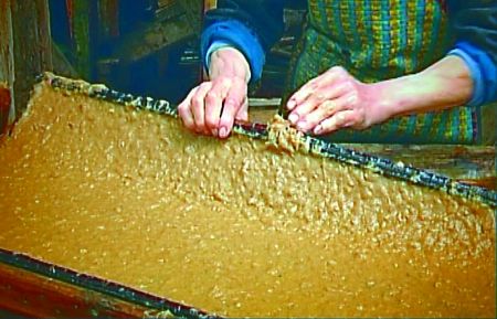 因為隨著造紙技術的不斷進步,這種傳統的手工造紙法很難和先進的技術競爭。造草紙的原料都是李高強自家種的竹子,他們用石灰水浸泡竹子,然后將竹子搗碎,將搗碎的泥面附于竹簾上面風干,紙就成型了。李高強一家四口人工作一天才能造30公斤左右的草紙,市場價每公斤在3元左右。李高強告訴記者:“在四十年前,這紙還用來包面,現在基本只用來祭祀。”