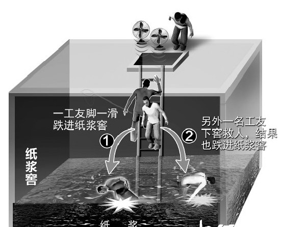 跑出值班室,直奔紙漿窖。只見一名工人臉色發(fā)白,癱坐在地上,指指窖口,上氣不接下氣地說:快!快!他們兩個在下面上不來了!