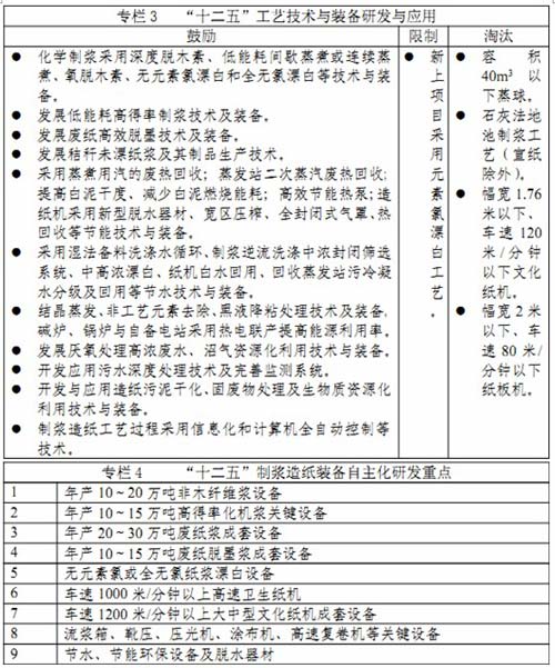 4 、加快淘汰落后產能,減排減污。著力加快解決重點流域和重點區域的造紙工業結構調整和污染問題。現有制漿造紙企業要進一步加大力度淘汰污染嚴重的落后工藝與設備,抓緊技術改造,淘汰年產5.1萬噸以下的化學木漿生產線、單條年產3.4萬噸非木漿生產線和單條年產1萬噸及以下廢紙漿生產線,以及窄幅、低車速、高消耗、低水平造紙機。禁止采用石灰法地池制漿(宣紙除外)、限制新上項目采用元素氯漂白工藝(現有企業逐步淘汰),禁止進口國外落后的二手制漿造紙設備。完善“三廢”治理設施,嚴格控制污染物排放。對經限期治理仍不能達標的企業或生產線要依法整頓或關停。“十二五”期間,繼續實行產業退出機制,調整和明確淘汰標準,量化淘汰指標,加大淘汰力度。新增日處理污水能力300萬噸,淘汰紙及紙板落后產能1000萬噸以上。