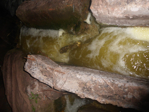 在一堵老磚墻上福利紙廠的的字樣依稀可見。金龍紙廠可能是利用原來的福利紙廠的場地廠房。金龍紙廠的排污沿河灘坡鋪設(shè),白色的泡沫,黑色的、暗黃的,整個江面沒有一絲縫隙。流速相當緩慢。