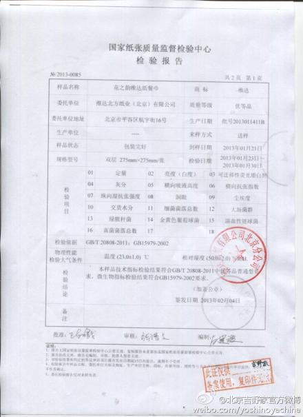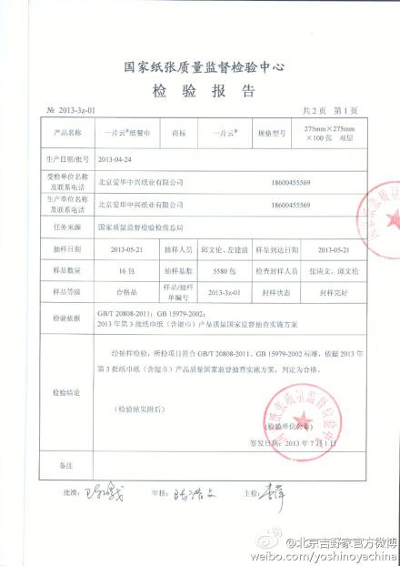 吉野家官方回應(yīng)稱,吉野家、DQ餐廳使用維達(dá)北方紙業(yè)(北京)有限公司的“花之韻維達(dá)紙餐巾”和北京愛(ài)華中興紙業(yè)有限公司的“一片云餐巾紙”。兩款產(chǎn)品均具有國(guó)家紙張質(zhì)量監(jiān)督檢驗(yàn)中心出具的批次檢測(cè)報(bào)告,報(bào)告中“可遷移性熒光增白劑”標(biāo)準(zhǔn)值、實(shí)測(cè)值均為“無(wú)”。檢測(cè)報(bào)告可追溯,請(qǐng)消費(fèi)者放心使用。