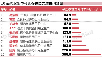 頗有諷刺意味的是,記者發(fā)現(xiàn),臺(tái)灣舒珊衛(wèi)生巾的官網(wǎng)上,列出了關(guān)于熒光劑有致癌危害的內(nèi)容,并表明其產(chǎn)品“絕無熒光劑”。然而此次檢測(cè)中,這款衛(wèi)生巾的可遷移性熒光增白劑含量高達(dá)386mg/kg,是含量最低的高潔絲的7倍。(如下圖)