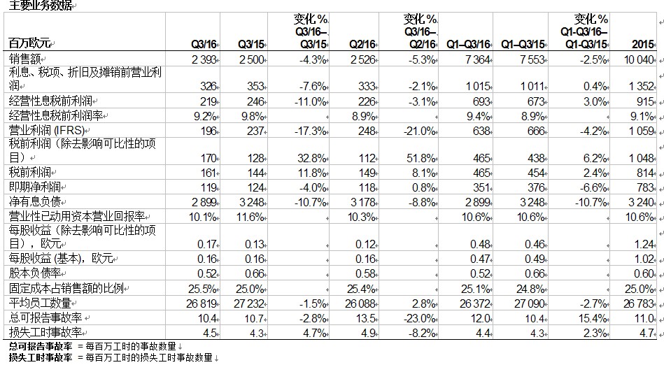 2016年第四季度的銷(xiāo)售額預(yù)計(jì)將在23.93億歐元上下,經(jīng)營(yíng)性息稅前利潤(rùn)預(yù)計(jì)將等同或略低于第三季度的2.19億歐元。年度停機(jī)維護(hù)所帶來(lái)的影響預(yù)計(jì)將比第三季度減少約3500萬(wàn)歐元。