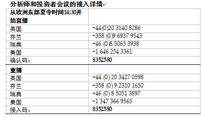 英國時間12點30分、美國東部時間7點30分)進行。會議將由集團首席執(zhí)行官宋思倫、首席財務(wù)官SeppoParvi與高級副總裁兼投資者關(guān)系主管UllaPaajanen-Sainio主持。希望提問的分析師與投資者可以參加電話會議(詳情如下)。所有參與者都可以通過網(wǎng)絡(luò)收看會議直播。