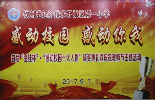 9月7日晚,由廣西金桂漿紙業(yè)有限公司贊助的欽州港經(jīng)濟(jì)技術(shù)開發(fā)區(qū)第一小學(xué)首屆“金桂杯”·“感動(dòng)校園十大人物”頒獎(jiǎng)典禮暨慶祝教師節(jié)主題活動(dòng)在該校圓滿舉辦。