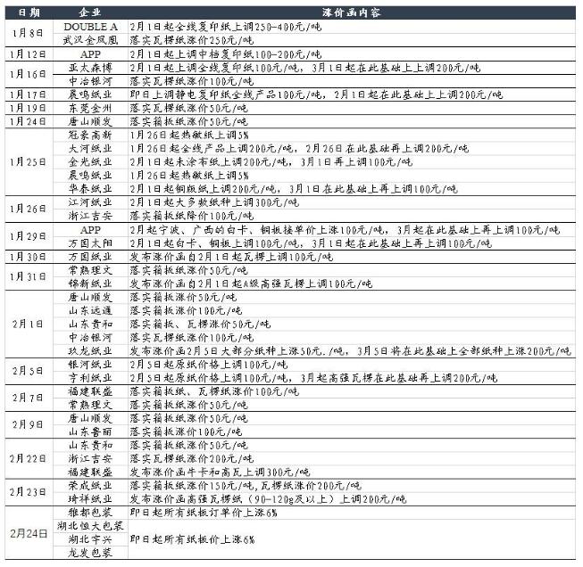 根據卓創資訊檢測數據顯示,截至2月25日,箱板紙市場價達到4763元/噸,漲價函實際落地;瓦楞紙3945元/噸,且部分紙企仍在持續上調出廠價(部分地區瓦楞紙價已高于4000元/噸)。目前紙價淡季上漲,廢紙額度多批次、小批量的發放形式或將有利于廢紙和紙價穩定。東吳證券預計隨著生產企業節后全面開工,紙價將維持強勢。 截止2月25日:箱板紙已達4763元/噸、瓦楞紙已達3945元/噸、 據卓創資訊檢測數據顯示,截至2月25日: 箱板紙市場價達到4763元/噸(周變化+13元/噸,月變化+13元/噸),漲價函實際落地; 瓦楞紙3945元/噸(周變化+32元/噸,月變化+57元/噸),且部分紙企仍在持續上調出廠價;(據悉,目前部分地區瓦楞紙價已高于4000元/噸) 白卡紙6445元/噸(周變化0元/噸,月變化0元/噸); 開年箱板瓦楞漲價情況一覽(單位:元/噸)