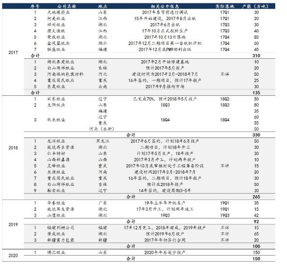 自2018年1月的第二周開始便陸續有部分基地落實瓦楞、箱板漲價,年后聯盛、榮成、金鳳凰等也紛紛加入了漲價隊列。 目前來看促使原紙淡季不淡的原因有: 。1)產業鏈庫存低位,年后開工催化供需向好; 。2)成本端國廢價格強勢也是支撐紙價上漲的主要原因。 預計對于獲批2018年廢紙進口配額的龍頭企業來說,1-2月隨著產品價格普漲,進口廢紙陸續到港,成本優勢有所擴大,噸利較去年年底低點已經趨勢向上,現在大家目光將持續關注于3月進口廢紙政策的執行! 廢紙額度多批次、小批量的發放形式或有利于廢紙和紙價穩定 受到春節期間廢紙停收的額影響,截至2月25日: 國內各地廢紙到廠平均價格2509元/噸(周變化-2元/噸,月變化+43元/噸); 美廢11#外商平均價230美元/噸(本周變化0美元/噸,過去一個月變化-15美元/噸); 隨著3月后0.5%外廢標準的政策執行臨近,預期國廢需求上行將推升產品價格。2017年紙價的急漲急跌對下游包裝行業造成了較大沖擊,平滑紙價波動已經受到國務院、環保部、造紙協會等機構的高度重視。環保部在2017年《限制進口類可用作原料的固體廢物環境保護管理規定》的征求意見稿中明確提到,固體廢物進口許可證的頒發要按季度分批郵寄。東吳證券認為廢紙額度多批次、小批量的發放形式將有利于廢紙和紙價穩定。目前紙價淡季上漲,2018年原紙價格中樞或將大幅上行。 2018年原紙投放產能在300萬噸左右,不必對新增產能過分擔憂 據東吳證券數據,2017年行業合計規劃的新增產能瓦楞箱板在445萬噸左右,而由于環保政策增加了產能落地的壁壘,目前可跟蹤的投放產能僅300+萬噸;預期2018年隨著環保邊際趨嚴+原材料受限持續壓制新增產能投放,市場無需對行業目前可統計的新增產能過分擔憂。 圖表4:17-19箱板新增產能投放一覽