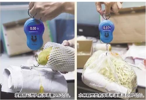 芒果箱里裝著厚厚的碎紙 據一位常年打掃該市場的環衛工透露,水泥紙箱是從上游批發商那里直接過來的,但也有些商家會專門聯系做水泥紙箱的工廠,進行加工定制。隨后,記者找到市場內一家廢品收購站。此時,一位中年大姐正在收拾紙箱。記者以要做水果生意的小販身份詢問是否有灌注水泥的紙箱,她告訴記者,以前有一段時間市場里確實有灌注水泥的紙箱。 這位大姐說,市場內還會往水果箱里填充很重的廢紙。她說,裝芒果和西瓜的箱子,其中的貓膩就會多一些。她還將收來的廢紙展示給記者看,一疊A4紙大小的白色糙紙,看起來不重,電子秤顯示有足足1斤。 買箱芒果少了1斤多,箱里有約2斤廢紙 記者隨機走進了一家水果店,打開芒果箱,墊在芒果下面的是厚厚的廢紙,隔著廢紙,看不到下面是否還有別的東西。記者表示要買一箱芒果,老板便從開箱的芒果中挑了八個拼成一箱。合箱時,老板又將一疊厚厚的廢紙放在芒果上。 合箱子一稱,重13.15斤。按每斤6元算,一共是78元多,記者講價后以75元買下。隨后,記者詢問為什么要把那疊廢紙放進水果箱。老板說,箱子從上游批發商那里過來就是這樣裝的。“如果單買芒果,是10元錢一斤,如果買一整箱就算6元錢一斤。”她告訴記者,裝芒果的紙箱一個要4元錢,可以回收重復利用。 當晚記者用電子秤重新稱重,發現比店家稱的少了1.25斤,總重僅為11.9斤。 打開包裝后記者發現:廢紙下面竟還墊著上文所提的厚紙,廢紙和厚紙加起來重1.94斤,紙箱重1.74斤,芒果凈重僅8.22斤——如果按實際單價來算,每斤芒果為9.75元。也就是說,連箱子一起買,盡管才6元一斤,但在不缺斤短兩的前提下,顧客實際要為紙箱和廢紙付22元。 要求商家自律,并增設公平秤 根據記者提供的情況,昨日上午,殿前市場監督管理所工作人員對中埔水果批發市場開展了現場排查。記者跟隨前往。 針對網友報料的水泥紙箱問題,工作人員對不同種類的水果箱進行逐一排查,但并未發現紙箱有異常。對于芒果箱填充廢紙增重的問題,該所副所長張瀟翎說,因為有裝箱和沒裝箱的水果單價不同,消費者可選擇購買,但箱子又不排除是運輸需要進行的包裝,目前要判斷是否涉及消費欺詐證據不充分。但她也說,這并不意味市場監管部門會默許和縱容這種行為,一旦有充足的證據就會進行行政處罰。張瀟翎表示,殿前市場監督管理所會進一步跟進此事的調查。同時,市場監管人員現場還對市場開辦人員提出自律要求。 而針對缺斤少兩的現象,市場開辦人員將在市場的一些路口放置公平秤,提示消費者保證自己的權益。消費者可以在購買后在公平秤秤,一旦發現重量不符可以找商家協商解決。