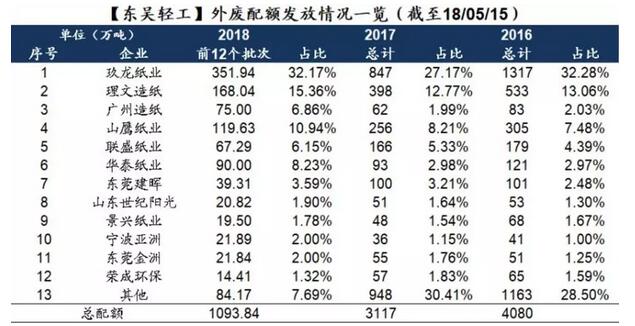 數(shù)據(jù)來源:Wind資訊,東吳證券研究所 “政府發(fā)糖”邏輯不變,前12批次管中窺豹 第12批次的外廢配額發(fā)放,實(shí)際僅1家紙企獲得2.33萬噸新增配額。我們認(rèn)為,環(huán)保部對(duì)于造紙產(chǎn)業(yè)原料端的約束(廢紙進(jìn)口“質(zhì)”、“量”的雙重管控)是本輪造紙龍頭高盈利的核心,再次強(qiáng)調(diào)在政策態(tài)度指引下國廢逐漸成為稀缺資源,上游國廢的議價(jià)能力及利潤空間逐漸增強(qiáng)。 短期來看,內(nèi)外廢價(jià)差或繼續(xù)擴(kuò)大,使得玖龍紙業(yè)、理文造紙、山鷹紙業(yè)等具有外廢額度的廢紙系龍頭充分享受內(nèi)外廢價(jià)差紅利(18年前12個(gè)批次中玖龍紙業(yè)32.17%、理文造紙15.36%、山鷹紙業(yè)10.94%,份額比例均有提升)。長期來看,在國內(nèi)和海外充分布局兼具資金實(shí)力的造紙龍頭在本輪洗牌中有所獲益。 圖表3:配額發(fā)放情況一覽(單位:萬噸)