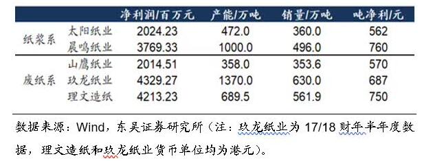 數(shù)據(jù)來源:公司公告,東吳證券研究所 從17年至今原料和紙價(jià)走勢來看:17年度上半年隨著原紙行業(yè)的供需景氣上行,紙價(jià)漲幅超過原料成本,紙企的單噸盈利普遍向上;17年下半年及18年一季度,在原料成本均大幅上漲的背景下,紙企龍頭由于自身獲取和自給原料的能力得到成本紅利,從而獲取超越行業(yè)的增長。 圖表6:龍頭的產(chǎn)能和單噸盈利表現(xiàn)(單位:百萬元/港元、萬噸)