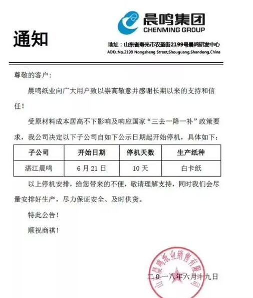 環保因素、成本上升導致供給端有所減弱,但是需求增速放緩幅度要更為明顯,這對生產企業而言,顯然不是什么好消息。面對持續陰跌的成品紙價格,各家龍頭紙企開始聯手保價,但是,“停產保價”短期內能起到的效果無非是止住跌勢,真正的轉機仍需等待需求端的明顯好轉。 晨鳴集團7月份再停白卡紙機!