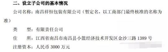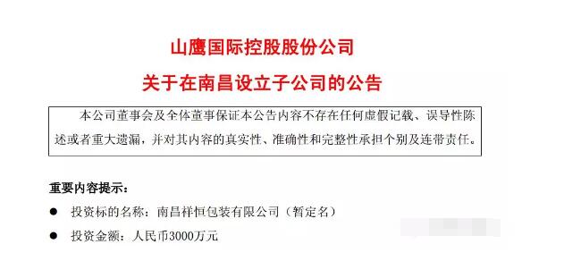 7月12日,山鷹國際控股股份公司發布公告,宣稱為完善地域布局,進一步滿足現有客戶群體的需求,其全資子公司祥恒創意包裝有限公司擬出資人民幣3000萬元設立南昌祥恒包裝有限公司。