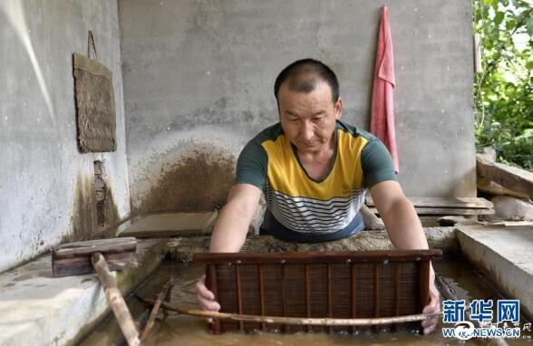 7月22日,“西和手工麻紙”傳承人尹利紅在撈紙。新華社記者李笑攝