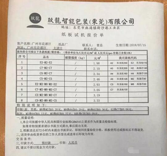 7月15日,玖龍智能包裝(東莞)有限公司的一份《紙板試機報價單》在坊間流傳。該報價單的價格比同行至少低10%,且報價含稅,但前提是預付款。 在當前市場需求匱乏的現狀下,該份報價在一定程度上影響到紙板行業的營利狀況,對市場秩序造成較大影響。