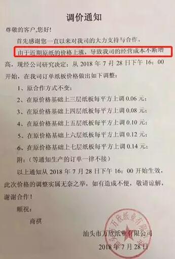 汕頭四萬欣紙業(yè)有限公司:由于近期原紙價格上漲,導致公司經(jīng)營成本不斷增高,決定自2018年7月28日下午16:00開始,紙板價格做出如下調(diào)整: 1.原合作方式不變; 2.在原價格基礎上三層紙板每平方上調(diào)0.06元; 3.在原價格基礎上四層紙板每平方上調(diào)0.08元; 4.在原價格基礎上五層紙板每平方上調(diào)0.10元; 5.在原價格基礎上六層紙板每平方上調(diào)0.12元; 6.在原價格基礎上七層紙板每平方上調(diào)0.14元。