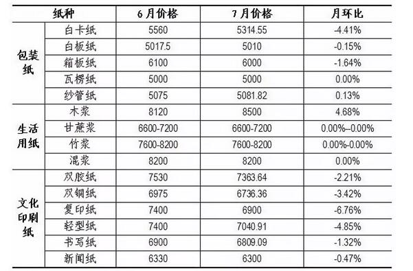 上周國廢黃板紙價格先跌后漲,紙廠廢紙到貨量變化不大,成品紙銷售略微增長后又歸于平淡,紙廠需求興趣有所降溫。隨著旺季來臨,箱板瓦楞紙價格將會有所反彈。 一、白卡紙觸底反彈,瓦楞箱板紙價格待觀望 8月伊始文化紙步入備貨季,主流廠家太陽、晨鳴、APP等紛紛發(fā)布漲價函,疊加產(chǎn)業(yè)鏈庫存相對較輕,上周雙膠、銅版的單噸價格小幅提漲落地。隨后于8月中箱板及白卡等包裝紙的節(jié)日備貨也會開始,但據(jù)跟蹤目前終端包裝廠及印刷廠的接單情況持續(xù)清淡,對應(yīng)白卡及箱板主流廠商8月延續(xù)限產(chǎn)保價,持續(xù)跟蹤后續(xù)紙價走勢。