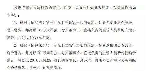 根據當事人違法行為的事實、性質、情節與社會危害程度,我局擬作出如下決定: 1、根據《證券法》第一百九十三條第一款的規定,對界龍實業責令改正、給予警告,并處以30萬元罰款;對其董事長、直接負責的主管人員費屹立給予警告,并處以10萬元罰款。 2、根據《證券法》第一百九十三條第三款的規定,對界龍集團責令改正、給予警告,并處以30萬元罰款;對其董事長、直接負責的主管人員費鈞德給予警告,并處以20萬元罰款;對其副董事長、總經理,直接負責的主管人員費屹立給予警告,并處以10萬元罰款。