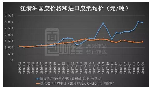 今年上半年,理文造紙營收為163.7億港元,同比增長43.1%;凈利潤為29.8億港元,同比增長35.9%。不僅絕對值都創新高,同比增幅也都是近五年來最高。 但是,值得注意的是,理文造紙的中期毛利率卻迎來2014年以來的首次下滑:從去年上半年的26.91%降至今年上半年的25.18%,減少了1.73個百分點。毛利率的下滑,可能正是市場擔憂的地方。 造紙廠的毛利率主要由兩方面決定:一個是紙品的出廠價,另一個是原材料的采購價格。而這兩端的價格在過去一年多漲幅迅猛,尤其是原材料價格的飛漲,讓市場對其未來的利潤產生擔憂。而今年美國掀起貿易戰后,擔憂更甚。 美廢價格將上揚,國廢供應能否跟上? 近年來我國一直在開展對“洋垃圾”的打擊。 2017年8月,相關文件出臺,將從2017年底開始正式禁止進口未經分揀廢紙。2018年3月,廢紙進口新規正式開始實施,新規要求申請進口廢紙許可的企業,年產能需達到5萬噸,且將進口廢紙含雜率從1.5%降至0.5%。 在對進口廢紙的多重限制下,國內紙廠將原材料采購轉向國廢,但是由于我國廢紙收購體系尚不完善,國廢的供應無法跟上激增的廢紙需求,從而導致國廢價格飆漲,而進口廢紙因需求關系價格有所回落。根據wind的原始數據,面包財經進行了適當的計算,國廢和進口廢紙價格走勢如下圖: