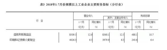 而造紙和紙制品業在1-7月份,營業收入為8509.5億元,同比增長12.6%。其中,主營業務收入為8360.1億元,同比增長12.5%。利潤總額為488.1億元,同比增長10.7%。