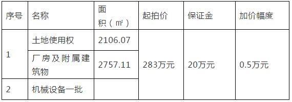 黃山市四方彩印包裝有限公司房地產及機械設備拍賣,起拍價283萬元 安徽省休寧縣人民法院將于2018年10月24日10時至2018年10月25日10時止(延時除外)在安徽省休寧縣人民法院司法拍賣網絡平臺淘寶網上對黃山市四方彩印包裝有限公司房地產及其機械設備進行公開拍賣。 一、拍賣標的: 黃山市四方彩印包裝有限公司所有的坐落在安徽省休寧縣東臨溪鎮上村的房地產(包括附屬建筑)、機械設備。 土地使用權證號:休國用(2009)第0588號;產權證號為:房地權證休字第30114764號,房地權證休字第31112986號,房地權證休字第30111577號。