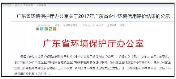 《公示》表示,根據《轉發環境保護部等四部委關于印發〈企業環境信用評價辦法(試行)〉的通知》(粵環〔2014〕48號)的要求,廣東省環境保護廳對納入2017年度企業環境信用管理的企業環境保護信用情況進行審核。