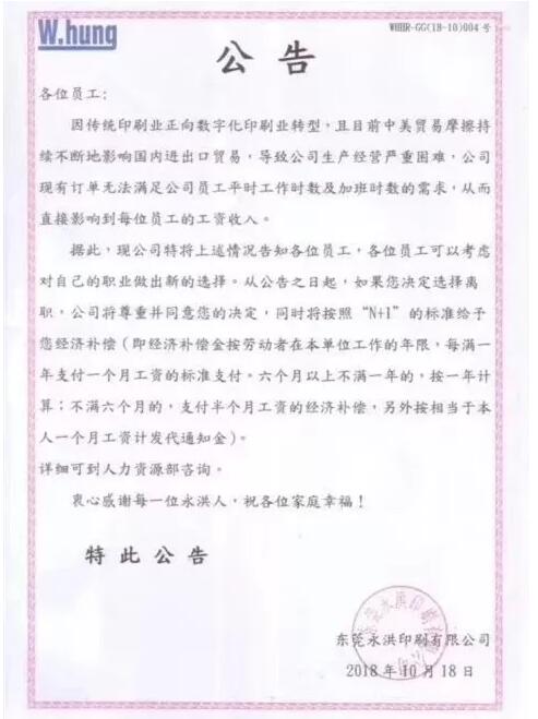 2018年10月18日,東莞永洪印刷發出第二封裁員公告,宣布對所有員工進行遣散,并將以“N+1”的賠償方案進行經濟補貼。事實上,早在一個半月前的8月底永洪印刷就發出了第一封裁員公告。但當時公司僅宣布停止印刷科的生產運營。可見,盡管這一個多月永洪一直在積極扭轉局面,但現實卻十分不樂觀,公司訂單嚴重不足,實在難以為繼。這家由香港永洪集團于1991年投資興建的印刷大廠,擁有著無比輝煌的過去,已成功走過了近30個年頭,如今卻落得如此下場,真讓人惋惜!這也足以見得當下實業老板之艱辛! 訂單不足致經營嚴重困難,東莞永洪發出第二封“裁員公告” 2018年10月18日,在經歷了一個半月的苦苦掙扎后,1800人大廠東莞永洪印刷有限公司無奈發出了第二封“裁員公告”。相比于第一封的僅僅裁掉印刷科的同事,這封卻是針對全廠所有員工的遣散信。 第二封裁員公告: “因傳統印刷業正向數字化印刷業轉型,且目前中美貿易摩擦持續不斷地影響國內進出口貿易,導致公司生產經營嚴重困難,公司現有訂單無法滿足公司員工平時工作時數及加班實數的需求,從而直接影響到每位員工的工資收入。 據此,現公司特將上述情況告知各位員工,各位員工可以考慮對自己的職業做出新的選擇,從公告之日起,如果您決定選擇離職,公司將尊重并同意您的決定,同時將按照“N+1”的標準給予您經濟補償。”