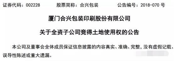 10月19日晚間,合興包裝對外發布公告稱,近日,在漢川市公共資源交易監督管理局五樓舉辦的國有土地使用權拍賣出讓活動中,公司全資子公司湖北合信智能包裝科技有限公司競得編號為P(2018)10號地塊的國有土地使用權。