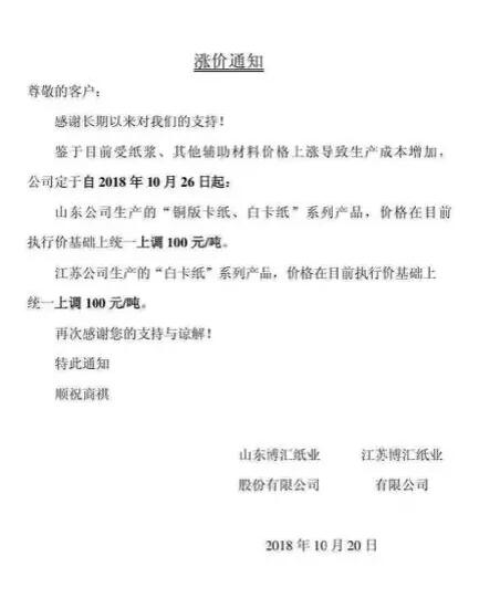 雙十一前,四大紙業(yè)巨頭再齊發(fā)漲價(jià)函,本周開(kāi)始漲價(jià)100元/噸 山東晨鳴紙業(yè)銷(xiāo)售有限公司:受近期原材料價(jià)格持續(xù)上漲影響,自10月26日起,我公司白卡、銅版卡產(chǎn)品在目前價(jià)格基礎(chǔ)上上調(diào)100元/噸。