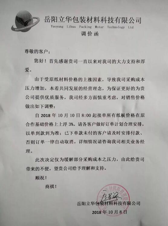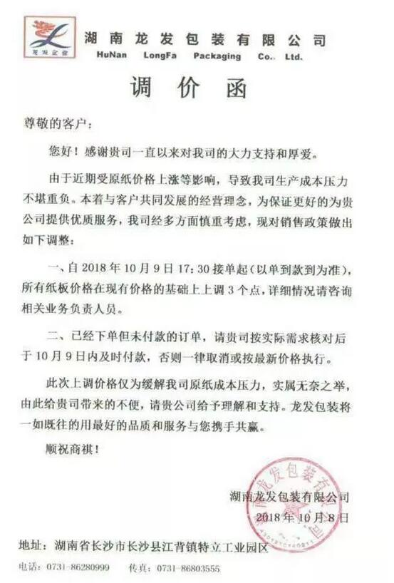10月超20家紙企漲50-200元/噸,紙企集中停機(jī)后傳統(tǒng)漲價(jià)“套路”? 國(guó)慶節(jié)過(guò)后不久,玖龍、聯(lián)盛、山鷹三大巨頭齊齊漲價(jià)的消息蜂擁而至。在此之前,浙江省永嘉縣穗豐紙業(yè)、福建華發(fā)紙業(yè)、山鷹紙業(yè)等企業(yè)已接連調(diào)價(jià),對(duì)瓦楞紙、T紙、紅杉?埖鹊膬r(jià)格上調(diào)了200元/噸。 而后多個(gè)紙業(yè)公司發(fā)出漲價(jià)通知,到10月15日,加上當(dāng)天調(diào)價(jià)的杭州金泰紙業(yè)有限公司在內(nèi),短短半個(gè)月的時(shí)間,已有超過(guò)20家造紙企業(yè)加入了漲價(jià)的行列,幅度在50-200元/噸不等。 10月部分紙企漲價(jià)函: