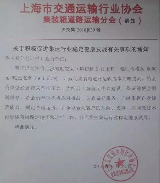 日前,92號(hào)汽油每升上調(diào)0.13元,95號(hào)汽油每升上調(diào)0.14元。據(jù)悉,山東省內(nèi)92號(hào)汽油最高零售價(jià)格為7.97元/升,而多地油價(jià)已進(jìn)入“8元時(shí)代”。 這次油價(jià)上調(diào),讓物流司機(jī)終于坐不住了。終于,運(yùn)費(fèi)調(diào)整消息來了! 多家車隊(duì)貨運(yùn)公司發(fā)布運(yùn)價(jià)調(diào)整函,在當(dāng)前運(yùn)價(jià)基礎(chǔ)上上調(diào)10% 近日,上海、寧波等主要港口地區(qū)交通運(yùn)輸協(xié)會(huì)集裝箱運(yùn)輸分會(huì),紛紛發(fā)布了“關(guān)于促進(jìn)集裝箱運(yùn)輸行業(yè)穩(wěn)定可持續(xù)發(fā)展通知”。建議各單位根據(jù)自身經(jīng)營能力,制定合理運(yùn)價(jià),并爭取合同客戶的理解、支持。