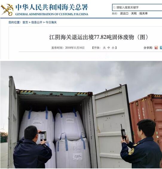 11月8日,在南京海關(guān)隸屬江陰海關(guān)監(jiān)管下,一批77.82噸固體廢物在江陰港口退運(yùn)出境。