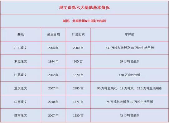 01 東莞理文造紙有限公司 成立日期:1994年,中國的第一所造紙生產廠房 地點:中國廣東省東莞市中堂鎮潢涌管理區 廠房面積:665畝 造紙機器:包裝紙,PM1、PM2、PM3及PM4 年產能:59萬噸包裝紙 配套設施:設有4條造紙生產線;66兆瓦的汽電一體化熱電站;兩個3000噸級碼頭泊位;每日處理3.5萬噸廢水的污水處理站。 02 江蘇理文造紙有限公司 成立日期:2002年,中國的第二所造紙生產廠房 地點:中國江蘇省常熟市經濟開發區沿江工業園理文路 廠房面積:1870畝 造紙機器:包裝紙,PM5、PM6、PM8及PM10 年產能:130萬噸包裝紙 配套設施:設有4條牛卡紙生產線;210兆瓦的汽電一體化熱電站;岸線815米的多用途碼頭;五個萬噸級碼頭泊位(單泊位最大停靠量為2萬噸);每日處理6萬噸廢水的污水處理站。 03 廣東理文造紙有限公司 成立日期:2004年,中國的第三所造紙生產廠房 地點:中國廣東省東莞市洪梅鎮河西工業區 廠房面積:2000畝 造紙機器:包裝紙,PM7、PM9、PM11、PM12、PM15及PM17;衛生紙,TM11及TM12 年產能:230萬噸包裝紙及10萬噸生活用紙 配套設施:6條造紙生產線;2條生活用紙的生產線;150兆瓦的汽電一體化熱電站;四個3000噸級碼頭泊位;每日處理13.5萬噸廢水的污水處理站。 04 重慶理文造紙有限公司 成立日期:2007年,中國的第四所造紙生產廠房 地點:中國重慶市永川區朱沱鎮 廠房面積:2985畝 造紙機器:包裝紙,PM13、PM16及PM20;衛生紙,TM1、TM2、TM3、TM4、TM5、TM6、TM7、TM8、TM13、TM15、TM16及TM17 年產能:90萬噸包裝紙、18萬噸漿、52.5萬噸生活用紙 配套設施:設有3條生產線及木漿生產線;12條生活用紙生產線;200兆瓦的汽電一體化熱電站;兩個3,000噸級碼頭泊位;每日處理6萬噸造紙廢水和1萬噸衛生用紙廢水及3萬噸制漿廢水。 05 江西理文造紙有限公司 成立日期:2010年,中國的第五所造紙生產廠房 地點:中國江西省九江市瑞昌市碼頭工業城 廠房面積:1371畝 造紙機器:包裝紙,PM18及PM21;衛生紙,TM9及TM10 年產能:75萬噸包裝紙及10萬噸生活用紙; 配套設施:設有2條生線;2條生活用紙生產線;兩個5,000噸級碼頭泊位;75兆瓦的汽電一體化熱電站;每日處理4.5萬噸廢水的污水處理站。 06 越南理文造紙有限公司 成立日期:2007年,越南的第一所造紙生產廠房 地點:越南后江省州城縣邁壬市鎮富有A第一階段工業區 廠房面積:1230畝 造紙機器:PM19 年產能:42萬噸包裝紙 配套設施:設有1條生產線;125兆瓦的汽電一體化熱電站;三個10000噸級碼頭泊位;每日處理2萬噸廢水的污水處理站。 如此龐大的產能,令理文造紙在中國的紙品包裝產業鏈具有舉足輕重的地位,也讓理文造紙成為下游不少紙箱包裝企業重點關注的企業。至于未來,正如在理文造紙首席執行官李文斌先生在中期業績報告所說: “展望未來,集團將積極提升發展規模,拓展多元化的紙漿業務,在穩定國內廠房生產量的基礎上,積極尋求國外拓展機會。憑借集團于造紙業龍頭的地位以及貫徹始終的穩健發展優勢,相信集團能為股東帶來最大的利益。”