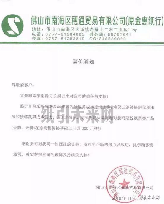 佛山市南海區(qū)穗通貿(mào)易有限公司(原金惠紙行):鑒于目前采購成本及運費等各項服務(wù)成本持續(xù)上漲,決定從即日起對晨鳴雙膠紙系類產(chǎn)品啊(云豹、云鏡)在原銷售價格基礎(chǔ)上上調(diào)200元/噸。
