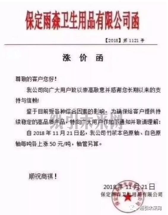 保定雨森衛(wèi)生用品有限公司:鑒于目前受各種綜合因素的影響,自11月21日起,我司竹漿本色原軸、白色原軸每噸各上漲50元/噸,軸管另算。