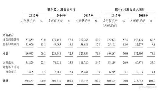 在此期間,順億控股的相關(guān)業(yè)務(wù)出現(xiàn)了快速的發(fā)展。其中: 1、營收占比占6成左右的柔版印刷紙箱,在2015-2018年上半年,實現(xiàn)收入1.58億元、1.76億元、2.67億元、1.50億元,分別占總收入的63%、57.9%、59%、61.8%; 2、營收占比約12%-14%左右的膠版印刷紙箱,在2015-2018年上半年,實現(xiàn)收入3307.6萬元、4399.5萬元、5868.6萬元、2227.5萬元,分別占總收入的13.2%、14.4%、12.9%、9.1%。 3、營收占比穩(wěn)定在25%左右的瓦楞紙板,是順億控股收入增長最快的業(yè)務(wù),在2015-2018年上半年,收入分別為5582.9萬元、7692.2萬元、1.12億元、6087.3萬元,分別占總收入的22.3%、25.3%、24.7%、25.0%。