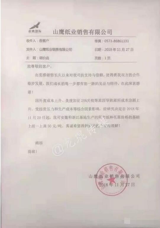 時(shí)隔一日,11月27日,山鷹紙業(yè)銷售有限公司又發(fā)出漲價(jià)函,宣布自12月29日起,安徽和浙江基地生產(chǎn)的所有紙種在原價(jià)格基礎(chǔ)上統(tǒng)一上調(diào)50元/噸。