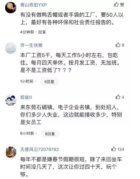 網友:毛織廠基本都是計件工資。3-10月份天天加班加點工資基本上都是一萬以上。早點回家陪孩子父母多好。工人當然會高興。[呲牙] 網友:打工就是這樣的,現在估計哪個廠子都是這種情況,上班就有工資拿,不上班就沒有工資拿!還是事業單位比較好點,放假工資照發!、 網友:給你們不放假,或者少放假,你們有意見,給你們多放假,比如這家,你們也有意見,工廠領導為了你們真是操碎心[捂臉][捂臉][捂臉] 網友:不要說東莞,溫州這邊鞋底廠,連帶鞋模廠幾乎關門大吉!員工能拿到工資回家過年不錯了-_-||放眼過去兩年,今年廠家生意非常淡! 網友:普工都沒有帶薪的,而且都是要寫請假條,不寫的就辭職吧。管理人員一般給半個月帶薪休假就不錯了! 網友:工廠一般不會有帶薪休假,這么長的假期,導致員工自離,變相裁員。大家懂的!